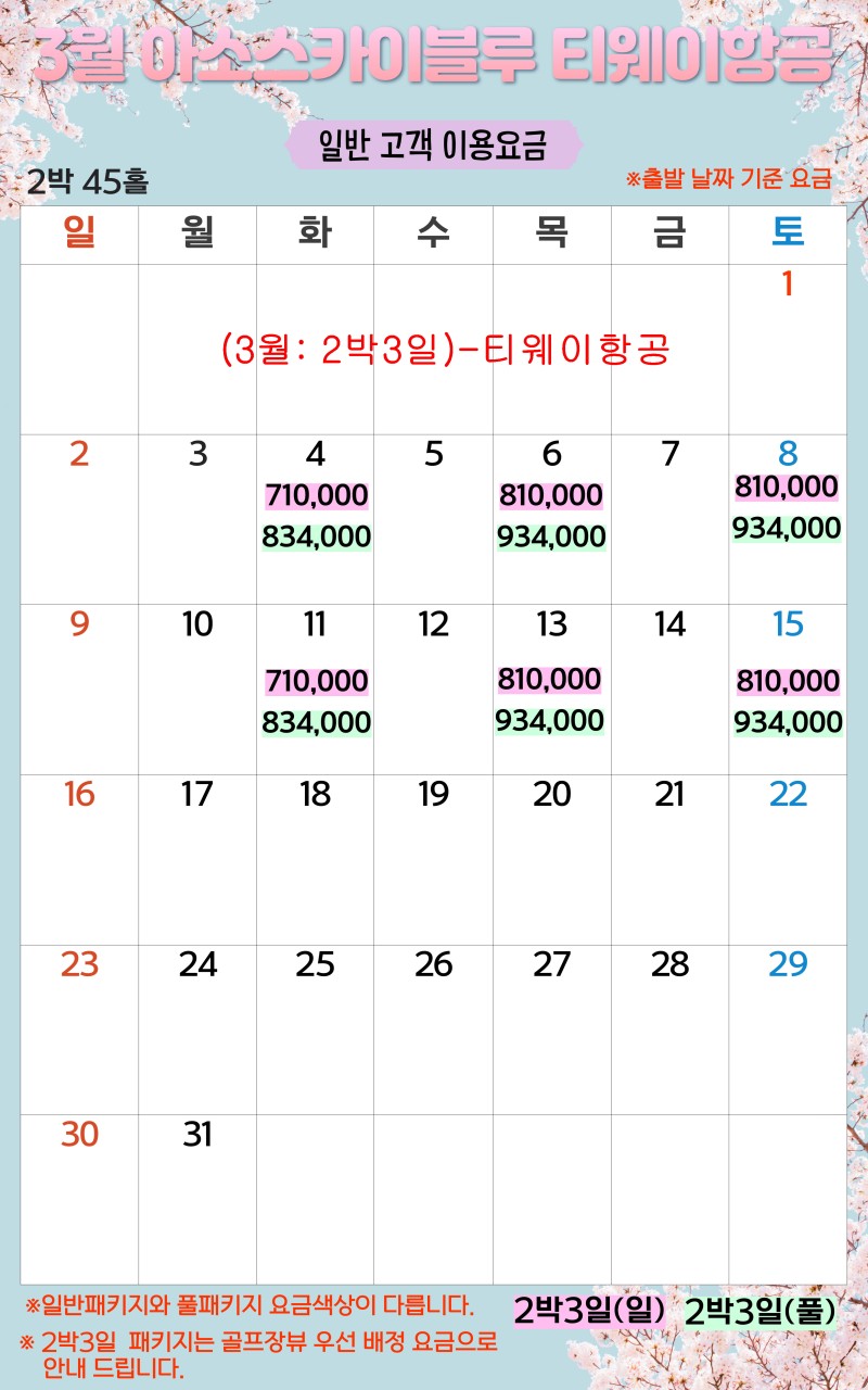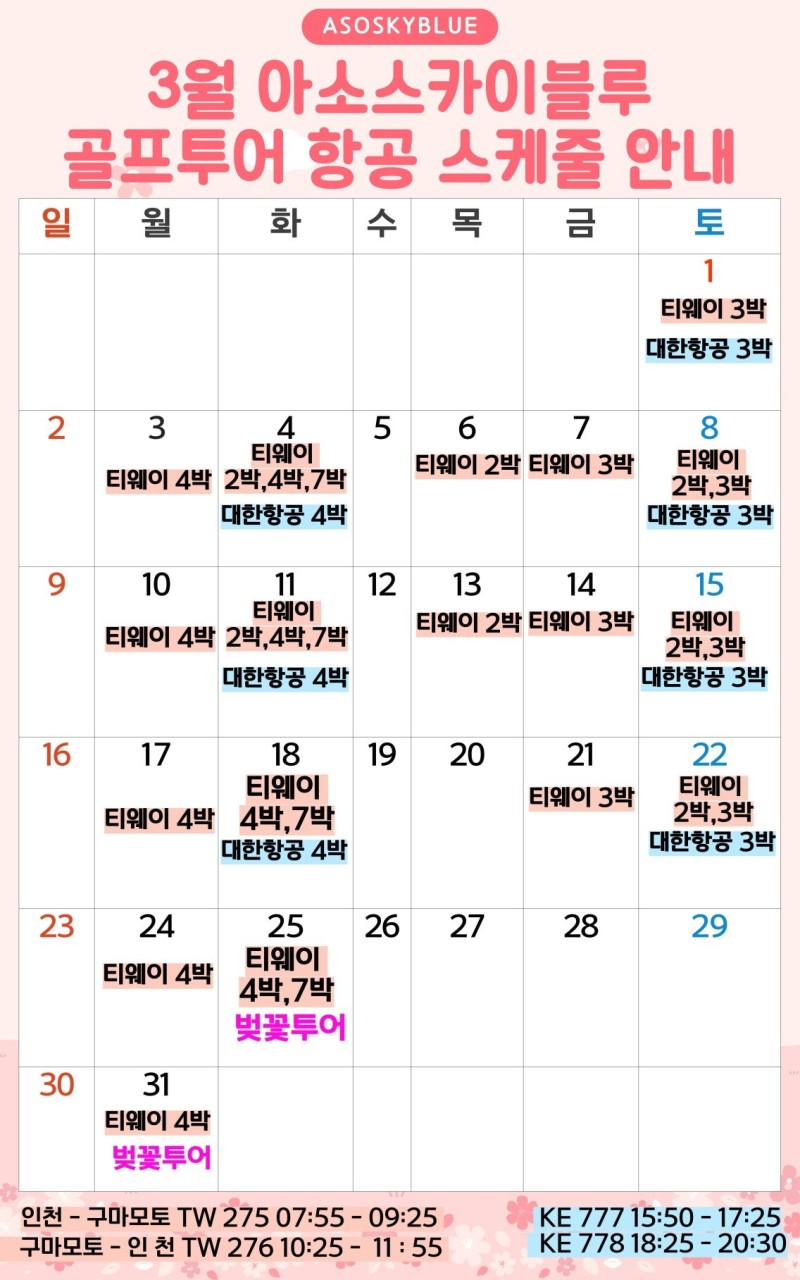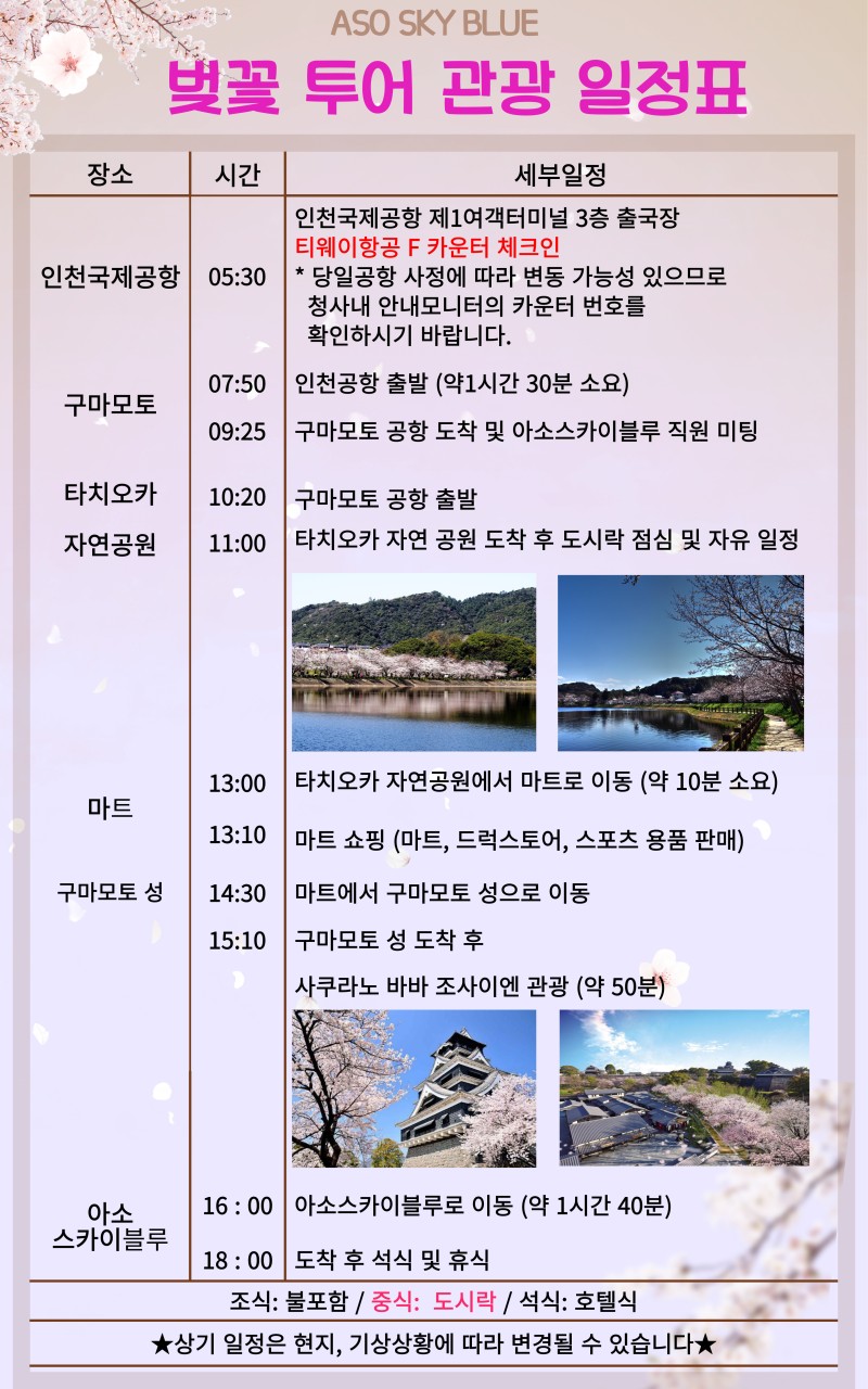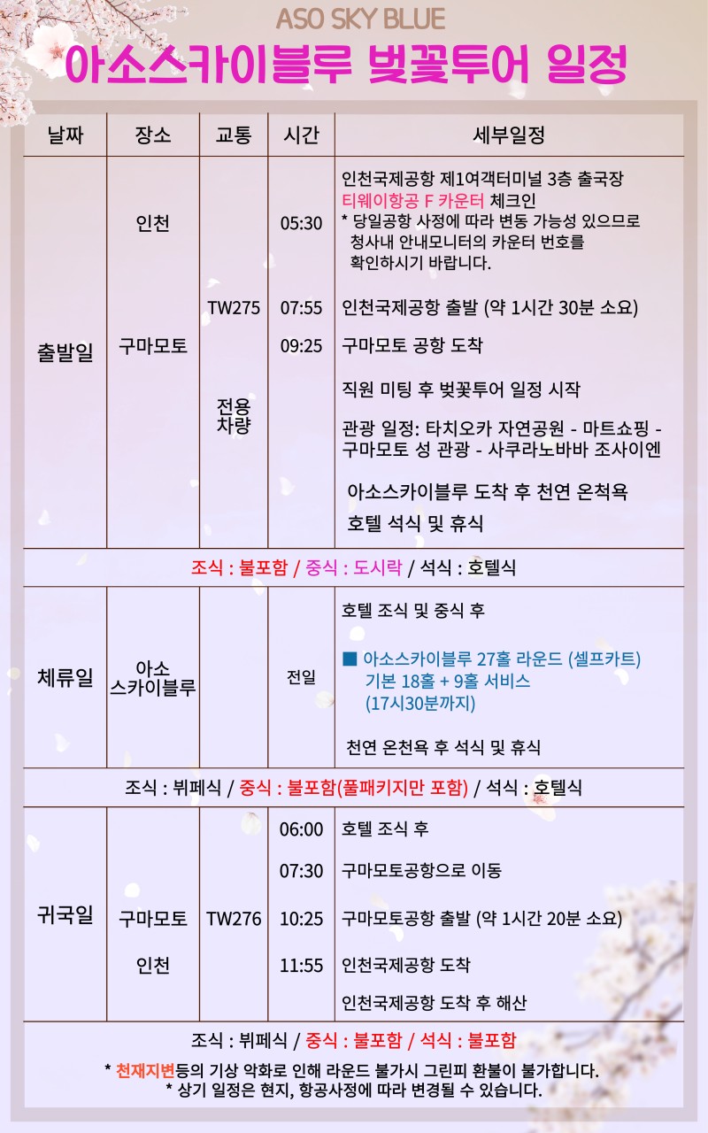 ** 2박3일: (화),(목),(토) 출발
