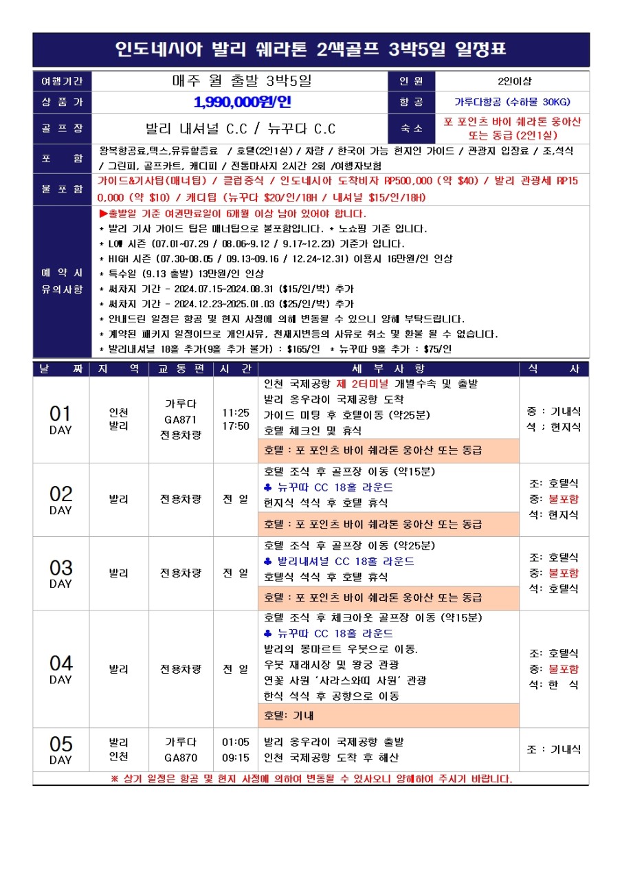 - 캐디팁 (뉴꾸다 $20/인/18H / 내셔널 $15/인/18H)